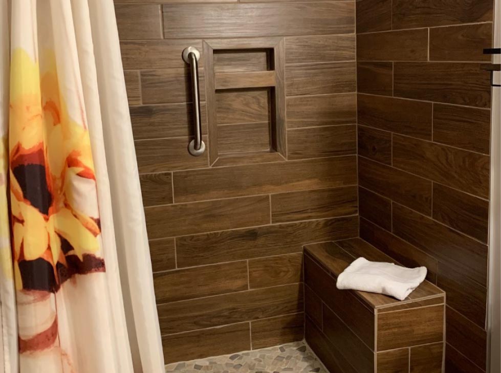 • Step-in shower with seating bench