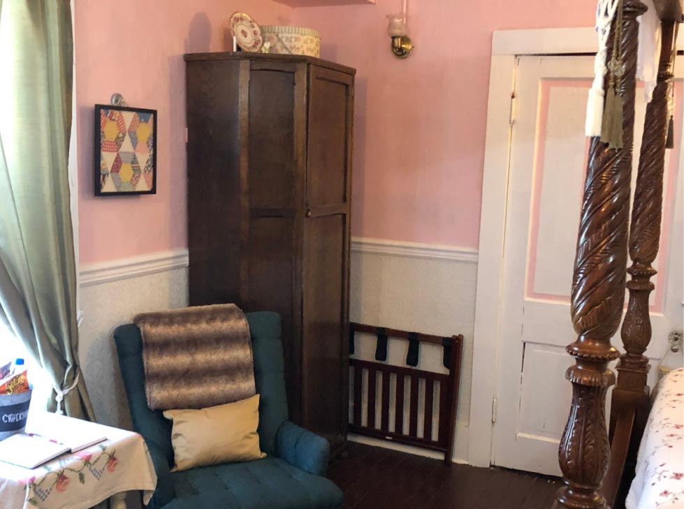 Experience a sense of nostalgic comfort when you stay in our Creekside room at the Olde Mill Inn Bed & Breakfast in Cumberland Gap. This charming room is located on the second floor just at the top of the staircase. You’ll marvel at the tasteful antique furnishings and large 1800s-style canopy bed. Guests who stay in this room consistently comment that they feel instantly cozy and comfortable before even unpacking their suitcases.