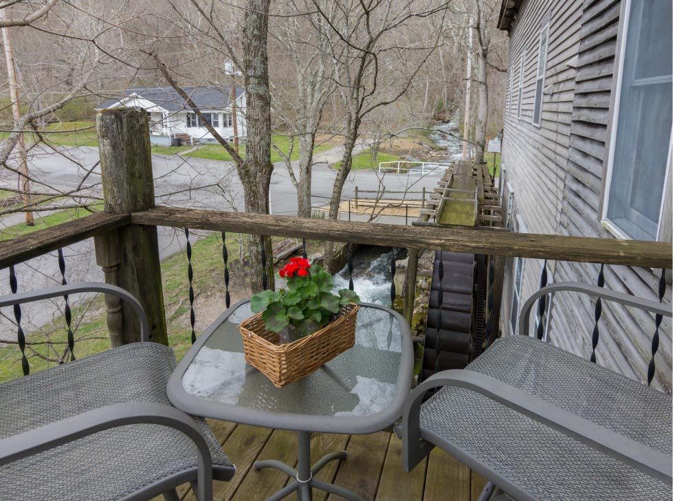 The hues of pink and white on the lath-and-plaster walls help to make you feel as if you’re wrapped in a well-worn cotton quilt. Think of it kind of like a comforting visit to grandma’s house…but with more privacy. The water wheel and babbling Gap Creek just outside will lull you into a deep, restful sleep you’ll have to experience to believe. Although it’s typically a two-guest room, a roll-away bed for a 3rd guest is available for a $25.00 per night fee.